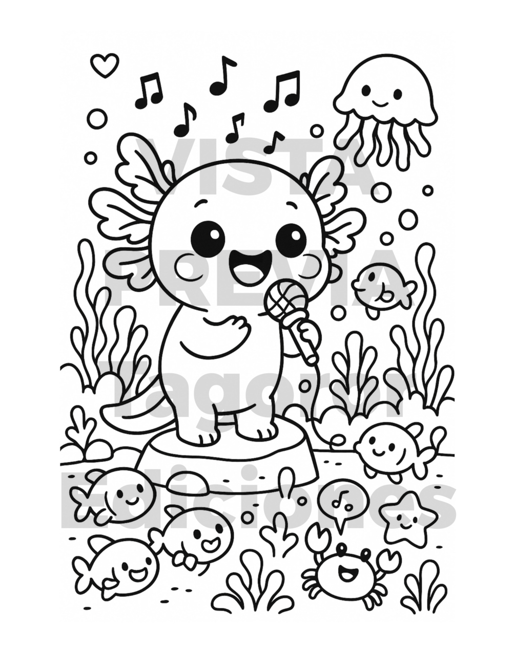 Obtendrás un libro digital en formato PDF de alta calidad con 60 ilustraciones únicas y adorables de ajolotes, perfecto para niños y amantes del coloreado. Cada página muestra al ajolote en escenas divertidas: pintando, jugando, explorando el espacio como astronauta ¡y mucho más!