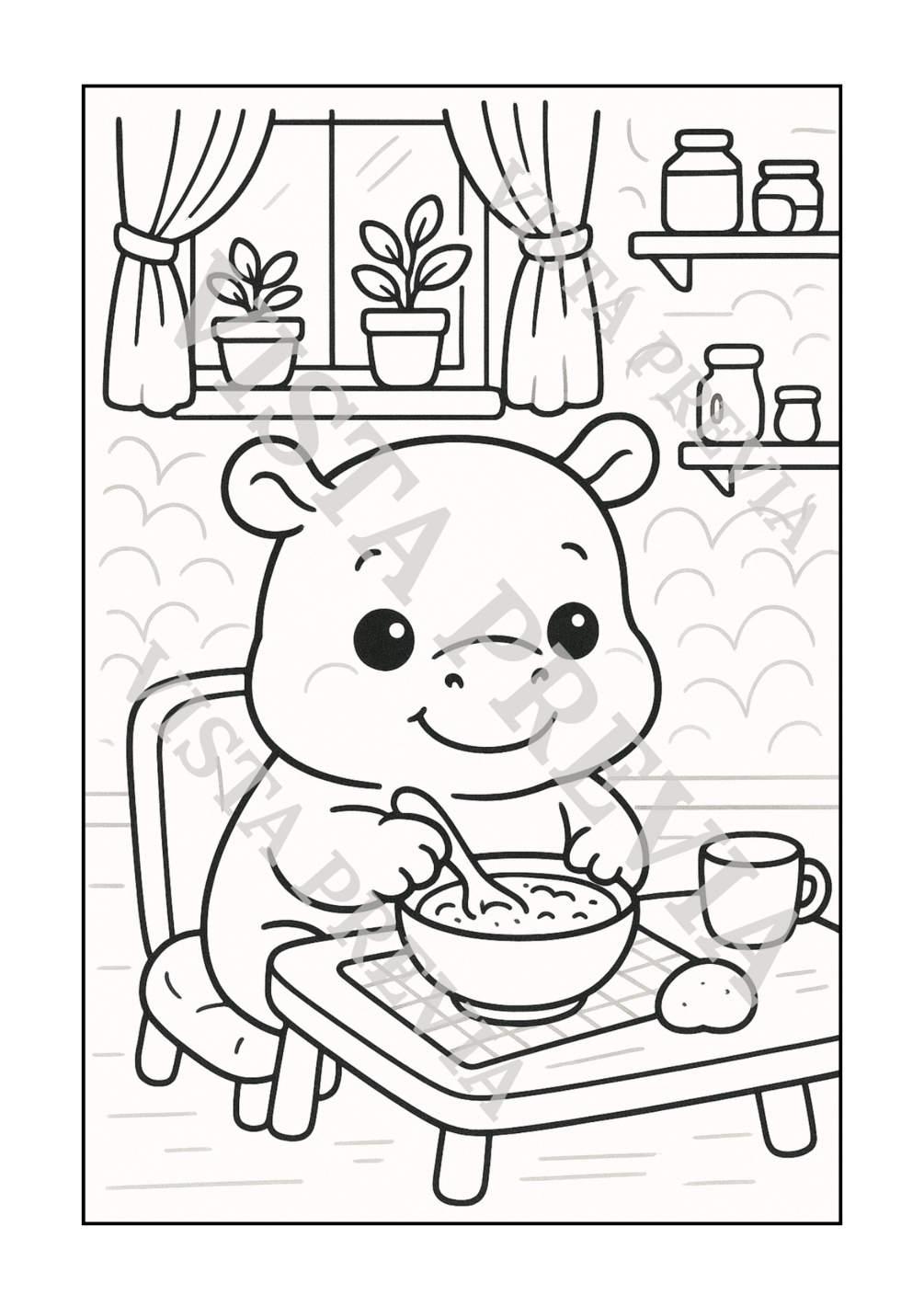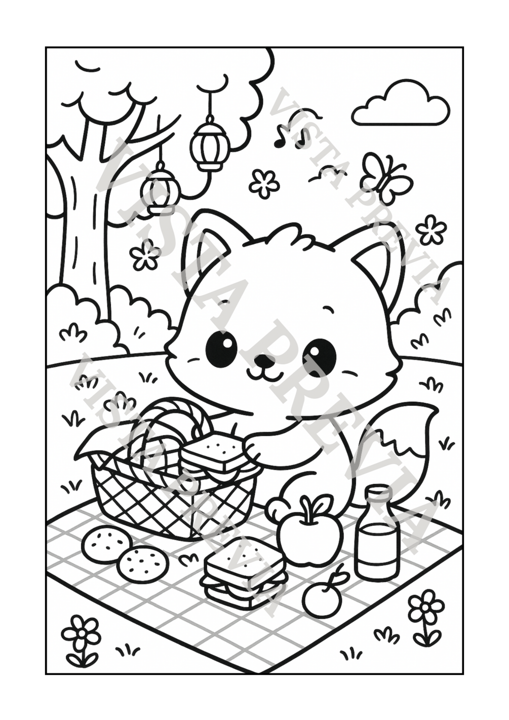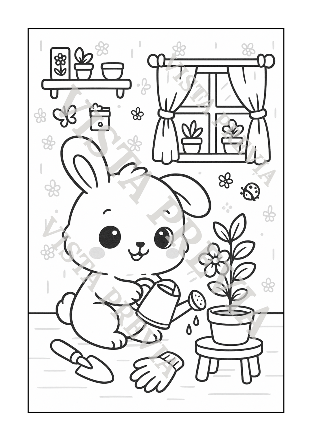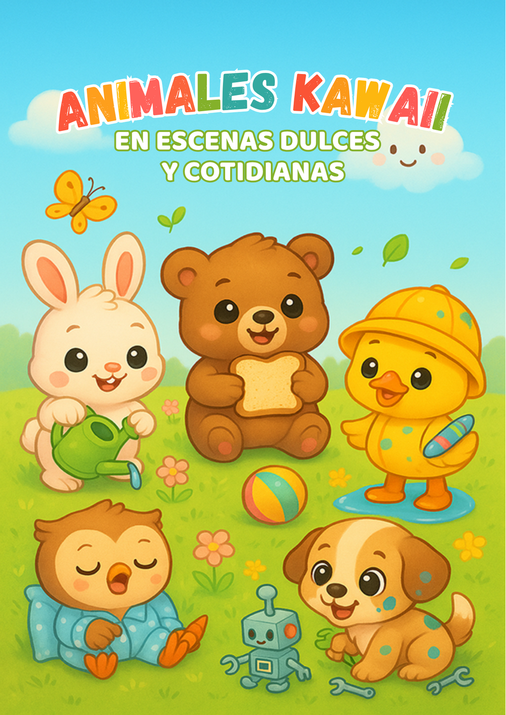 Libro digital para colorear con 15 adorables ilustraciones de animales kawaii en escenas cozy y cotidianas. Incluye un conejo regando flores, un zorro haciendo picnic, un hipopótamo comiendo y más. Perfecto para niños de 3 a 7 años. Descarga inmediata y pago 100% seguro.